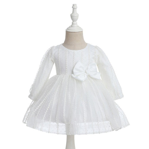 Vestido blanco mangas largas con encaje, volados en el cuello y gorra
