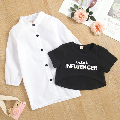 Camisa vestido blanco mangas largas, cuello mao y crop top negro con letras