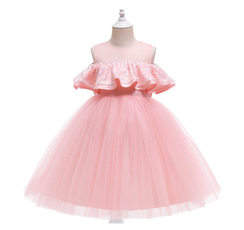 Vestido con volados en el pecho, detalle de lentejuelas y transparencia