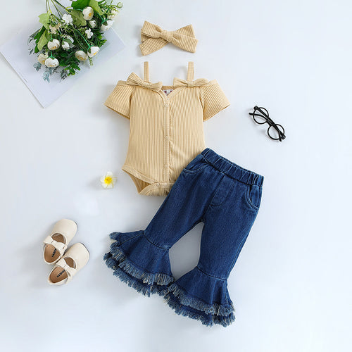Body acanalado con moños, pantalón jeans pata ancha y vincha