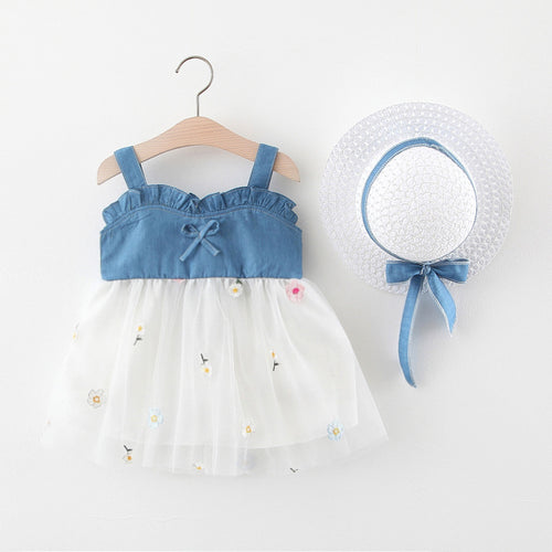 Vestido jeans, falda de tul con estampas de flores y sombrero