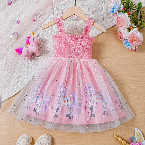 Vestido rosa engomado con estampas de unicornios y tul