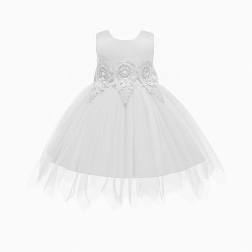 Vestido blanco de tul con encajes, perlas y moño