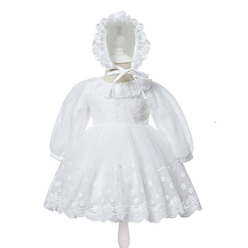 Vestido blanco manga larga con bordado de flores y gorra con detalles en broderie