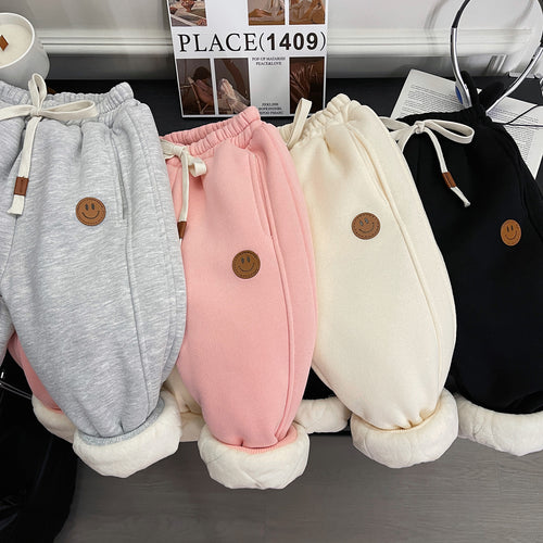 Pantalón pata ancha tipo corderoy con pompones y forro polar