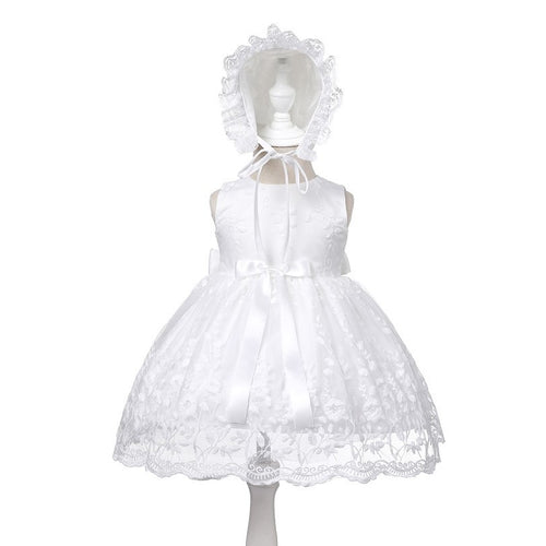 Vestido blanco con encaje, moño de seda y gorra