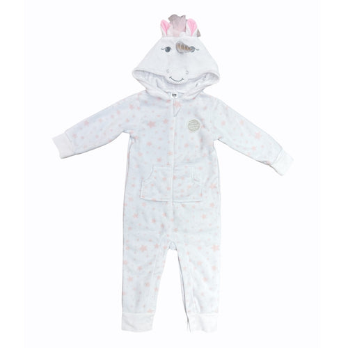 Body enterizo polar blanco con capucha de unicornio y estampas de estrellas