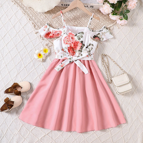Enterizo rosa con estampas de flores y falda de tul con volados