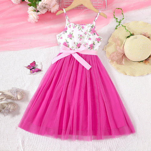 Vestido blanco con estampas de flores y falda de tul pink con cinto