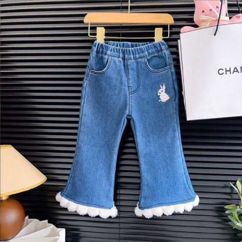 Pantalón pata ancha jeans con pompom y bordado de conejo con forro