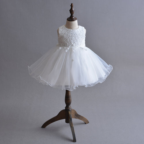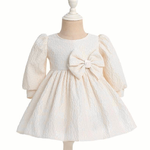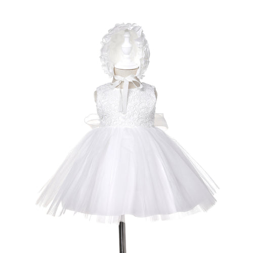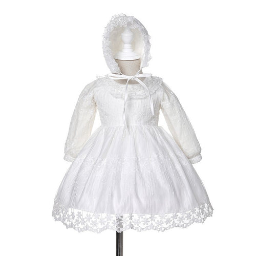 Vestido blanco mangas largas con detalles de encaje bordado y gorra