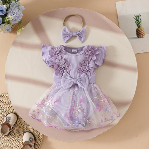 Body vestido lila con falda de tul, bordados de flores y vincha