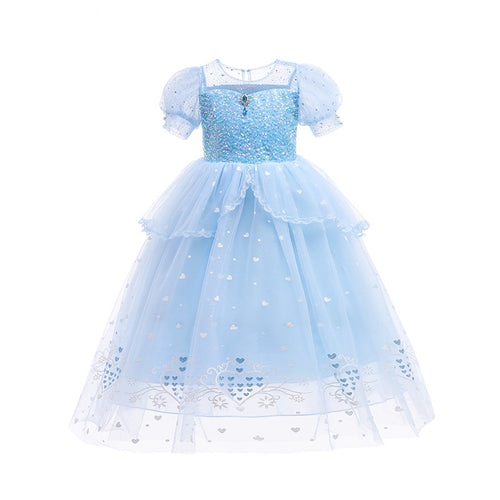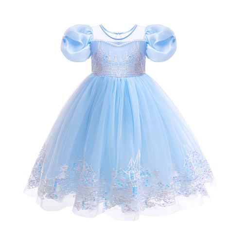 Vestido largo celeste con lentejuelas, manga abullonada estilo Elsa Frozen