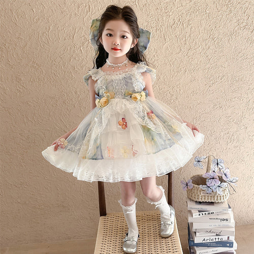 Vestido floreado con volados, hebillas, moño grande con tul de mariposa