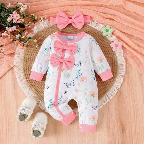 Body enterizo blanco con estampas de mariposas, moños y vincha rosa