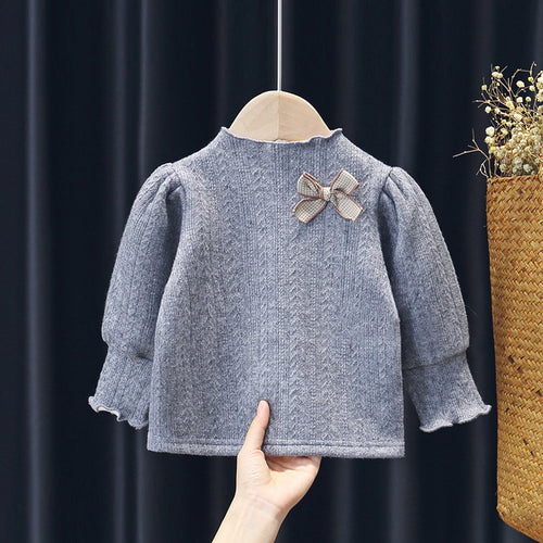 Blusa mangas largas gris de hilo, mangas abullonadas y moño, forro polar