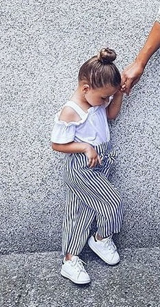 Blusa blanca hombro abierto con pantalón negro a rayas