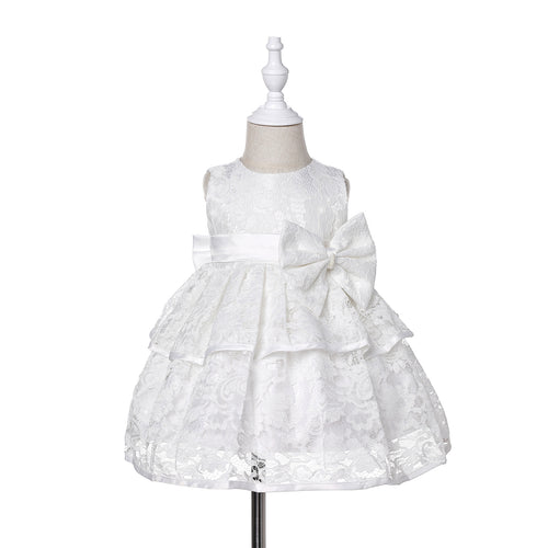Vestido blanco escalonado de encaje con moño