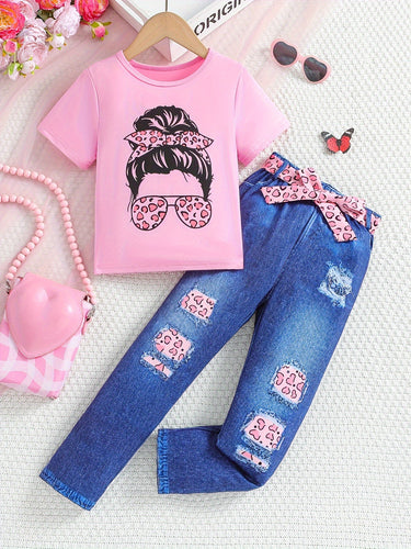 Blusa pink con estampas y leggins tipo jeans con cinto