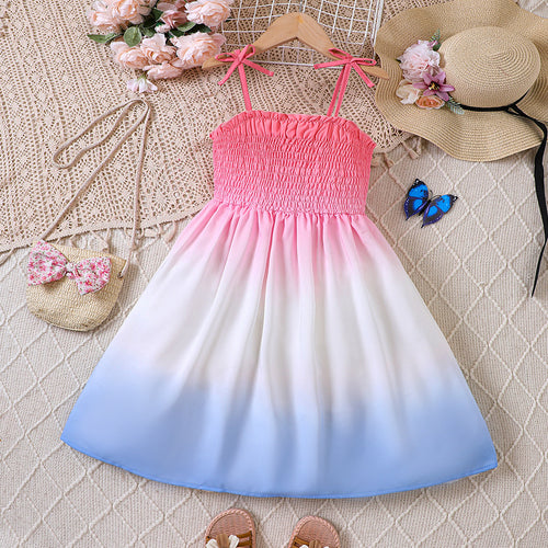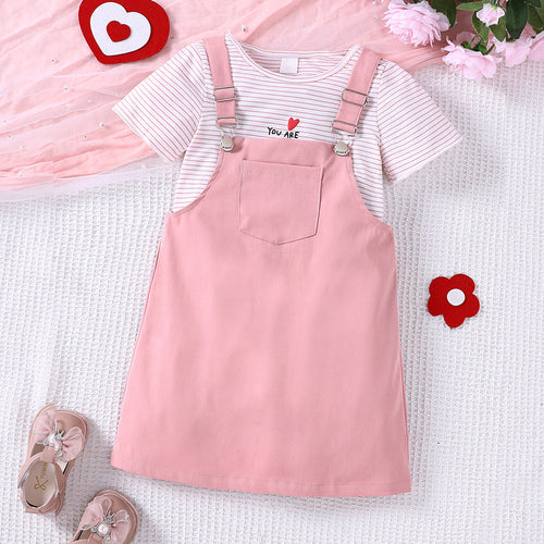 Vestido rosa tipo jardinera con remera blanca a rayas