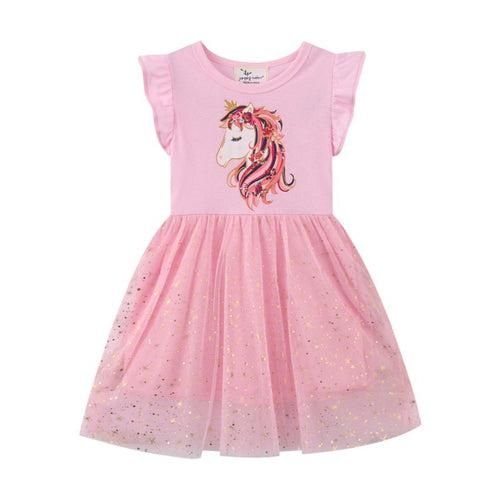 Vestido rosa de unicornio y falda de tul con brillo dorado
