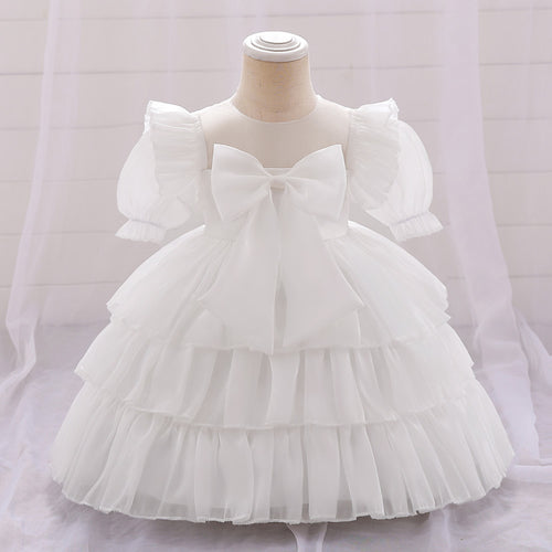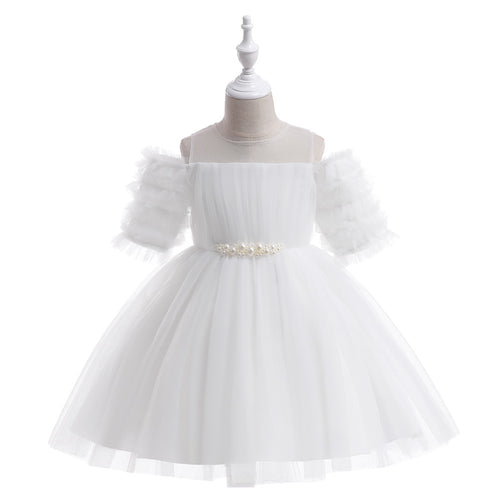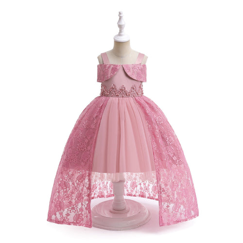 Vestido con detalles de encajes blanco y falda rosa de tul