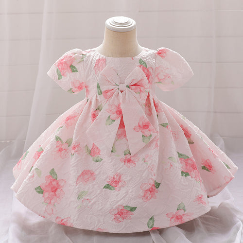 Vestido engomado salmón con estampas de flores y mangas abullonadas