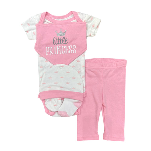 Kit de 7 piezas de princesa (body + pantalón + babero + manopla + media + gorra + funda para guardar)