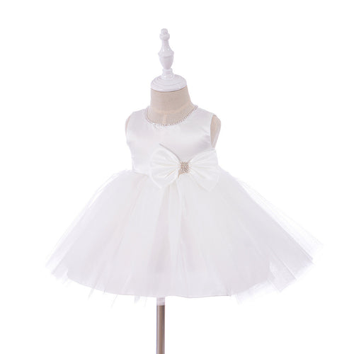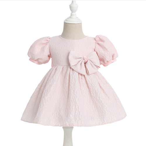 Vestido doble color, con brillo, mangas abullonadas y moño