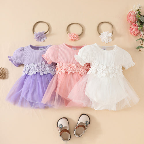 Body salmón, pollera con tirante de oso y estampas de flores con vincha