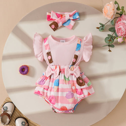Body verde con volado y vestido tipo jardinera floreado con vincha
