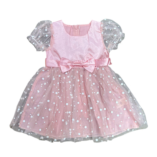 Vestido rosa con mangas abullonadas y falda de tul con motas blancas