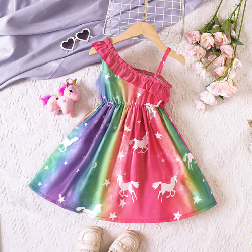 Vestido colorido con estampas de unicornio y volados