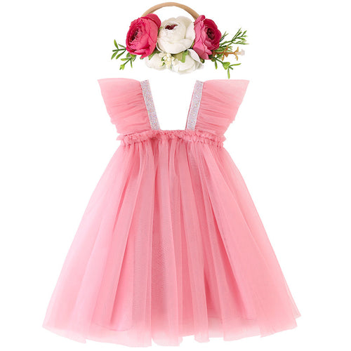 Vestido rosa viejo de tul con vincha de flores
