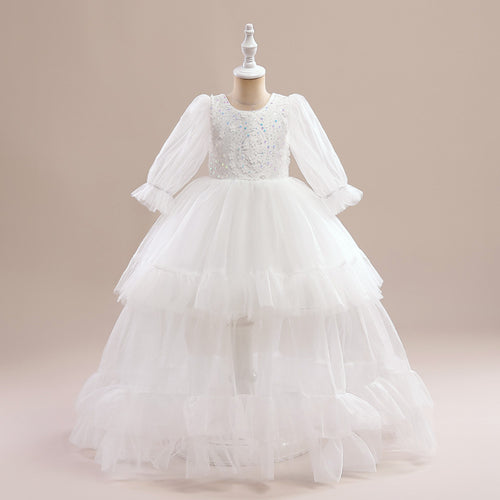 Vestido media manga blanco, largo de tul escalonado con bordados