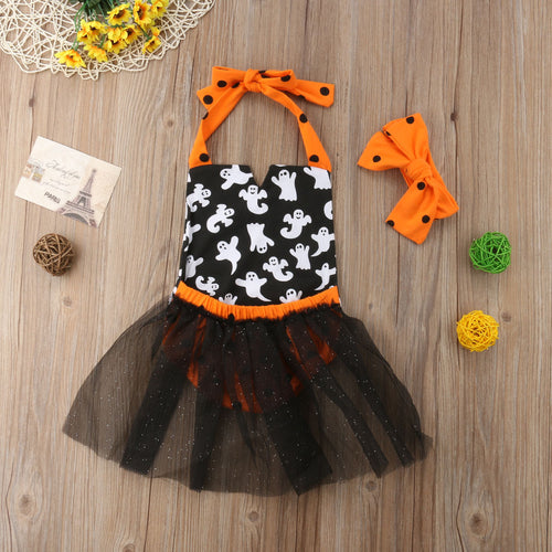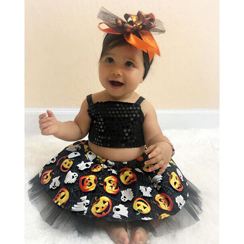 Blusa crop top con lentejuelas, pollera tutu negro con estampa de halloween