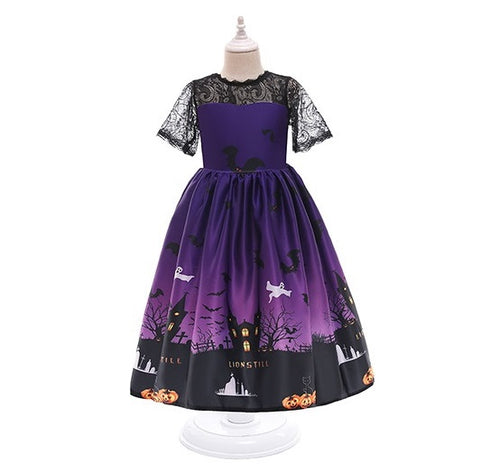 Vestido lila largo, mangas de encaje negro y estampa halloween