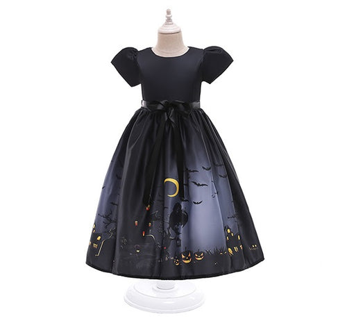 Vestido largo negro con manga abullonada y estampa halloween