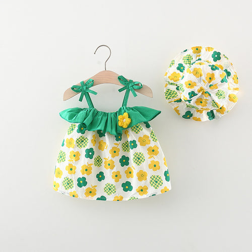 Vestido con estampas de flores y volados en verde con sombrero