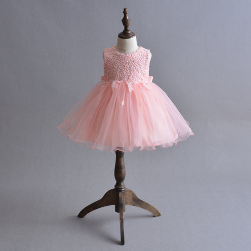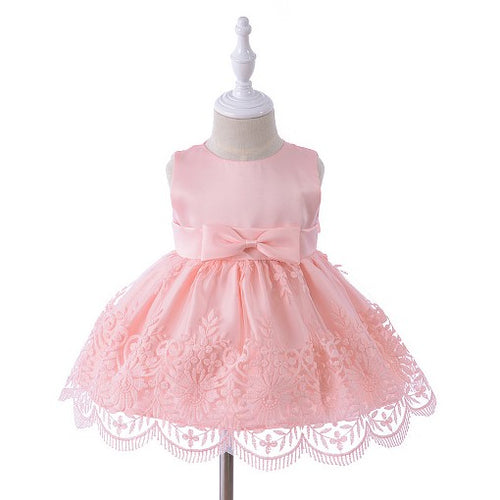 Vestido rosa, detalles de encaje y moño