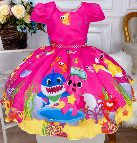 Vestido pink con estampas de Baby Shark con hebilla de moño