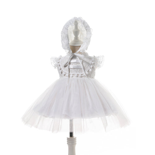 Vestido blanco de tul con volado en el hombro y gorro