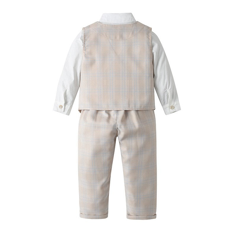 Camisa blanca con moño, chaleco y pantalón crema a cuadros