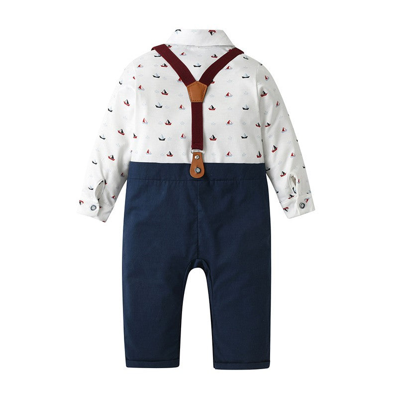 Body enterizo blanco con estampas, tirante, moño bordo y boina azul marino