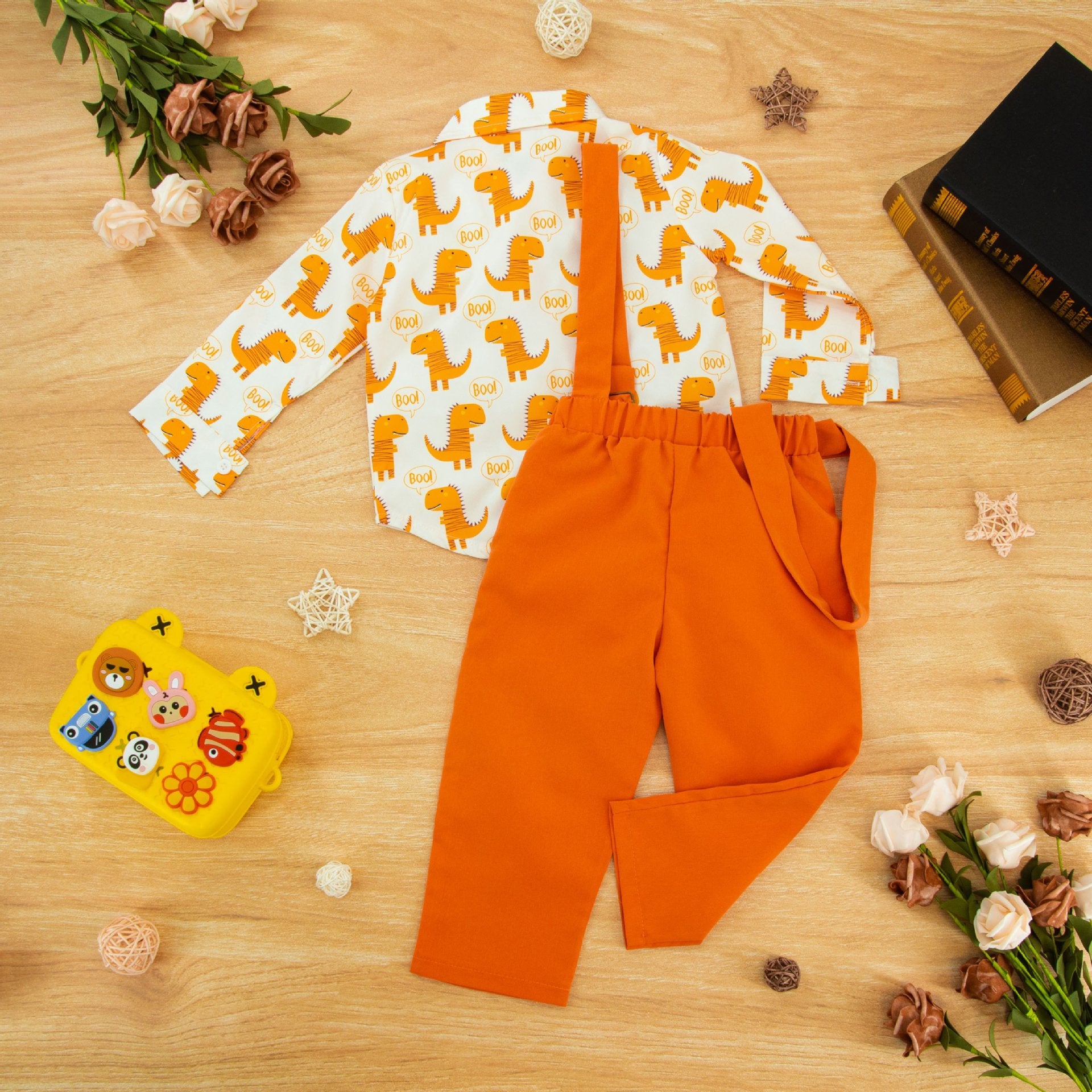 Camisa blanca con estampas de dino, moño y pantalón con tirante naranja