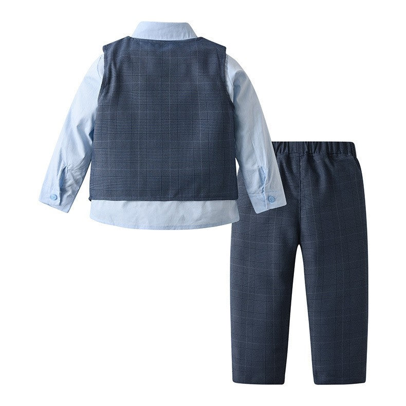 Camisa celeste con moño, chaleco y pantalón azul marino cuadrille