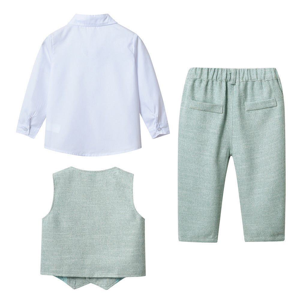 Camisa blanca con moño, chaleco y pantalón gris celeste