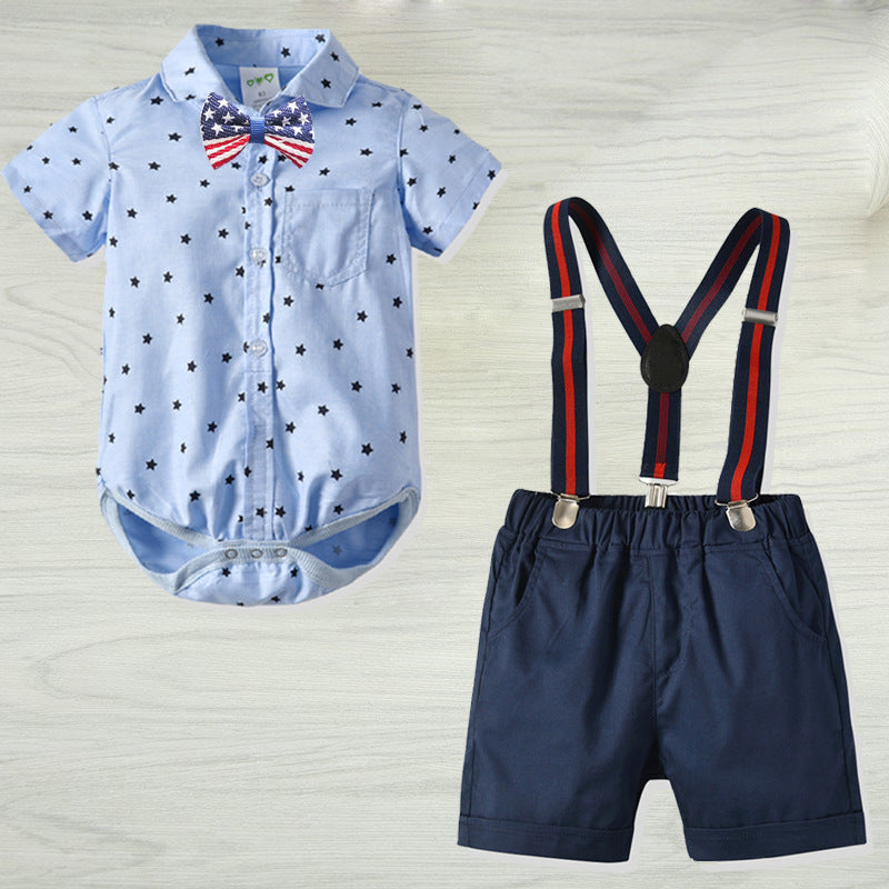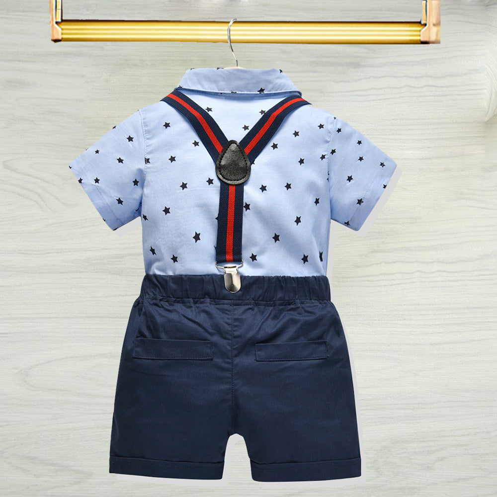 Camisa body celeste con estrellas, short azul con tirantes (NO incluye moño)