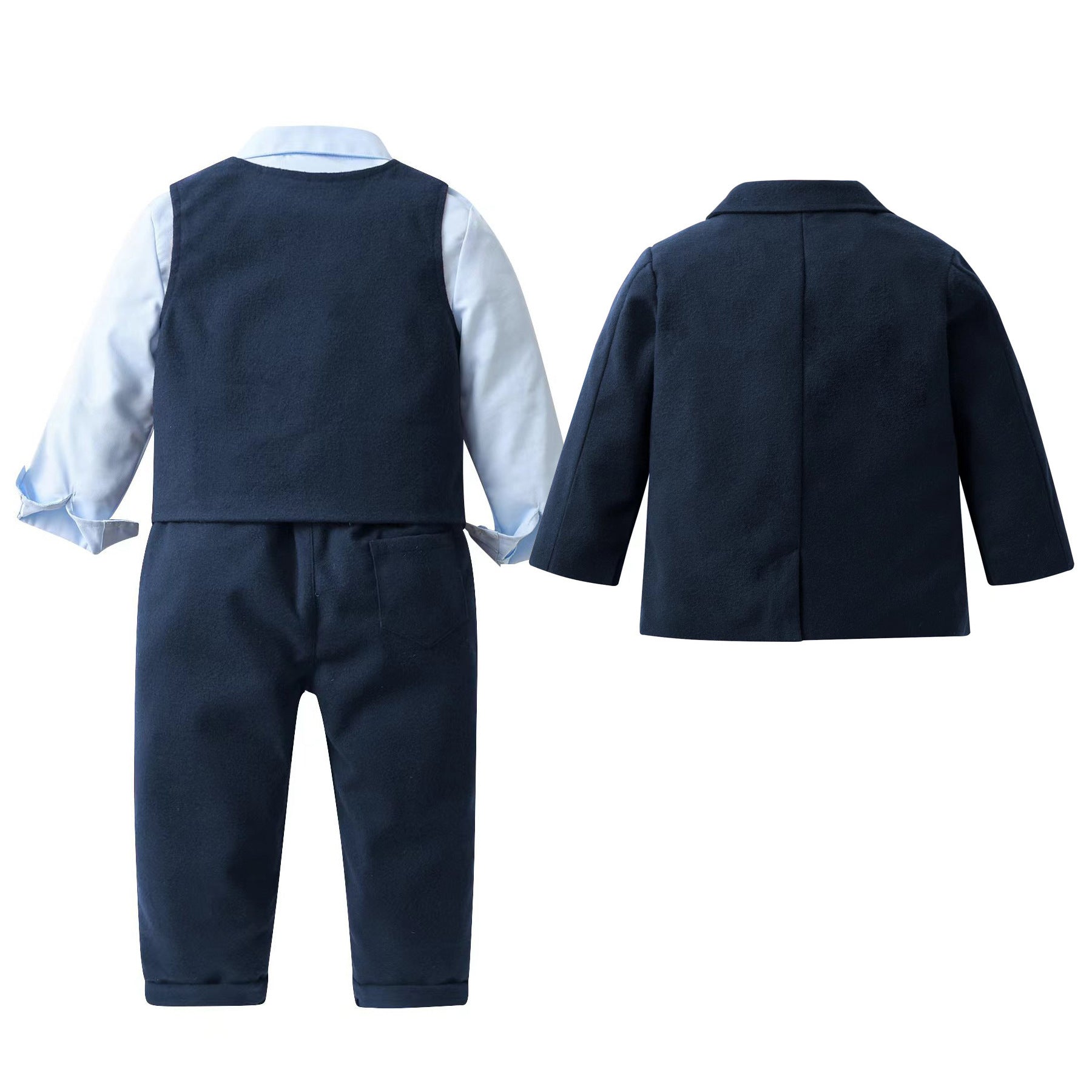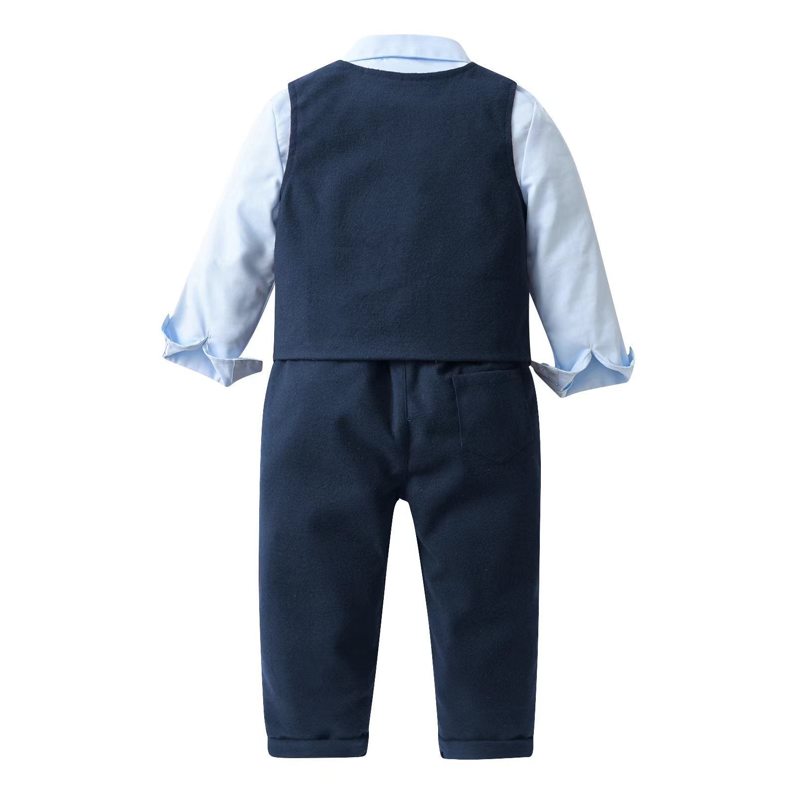 Camisa celeste con chaleco, moño y pantalón azul marino