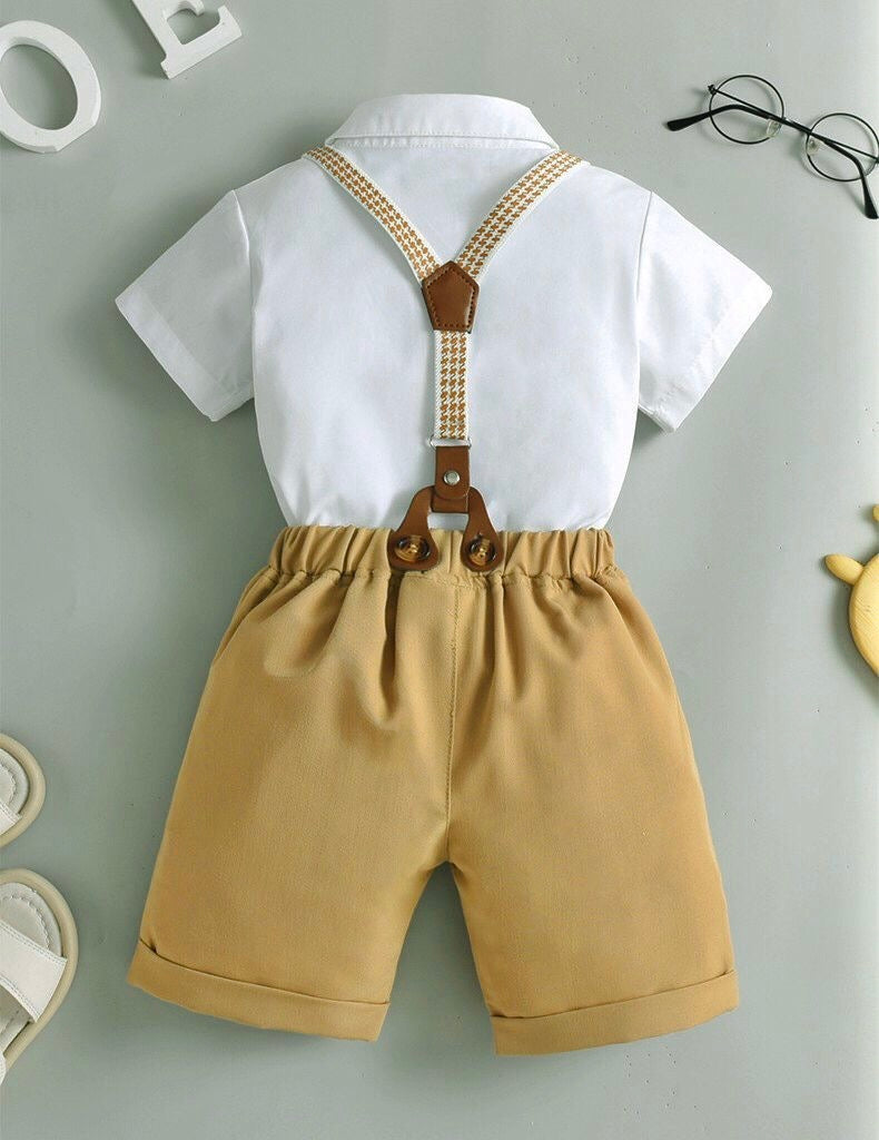 Camisa blanco con short beige, tirante cuadrille y moño